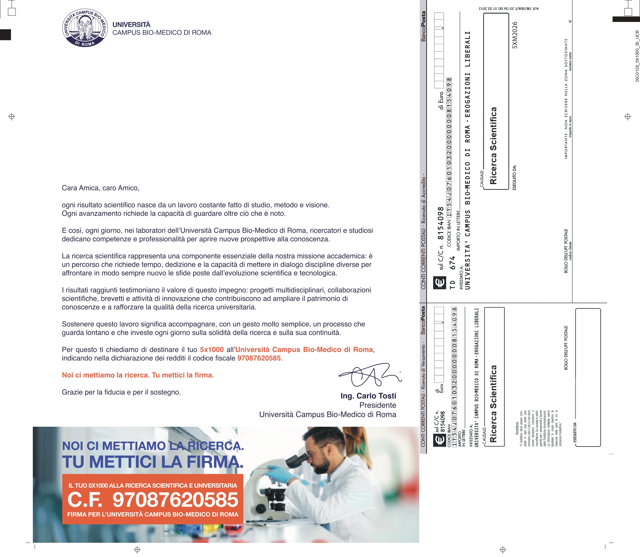 “Sostieni la Ricerca del @CampusBioMedico. Firma nel riquadro ‘Finanziamento agli Enti di Ricerca scientifica e dell’Università’ e inserisci il codice fiscale 97087620585. Io l’ho già fatto!