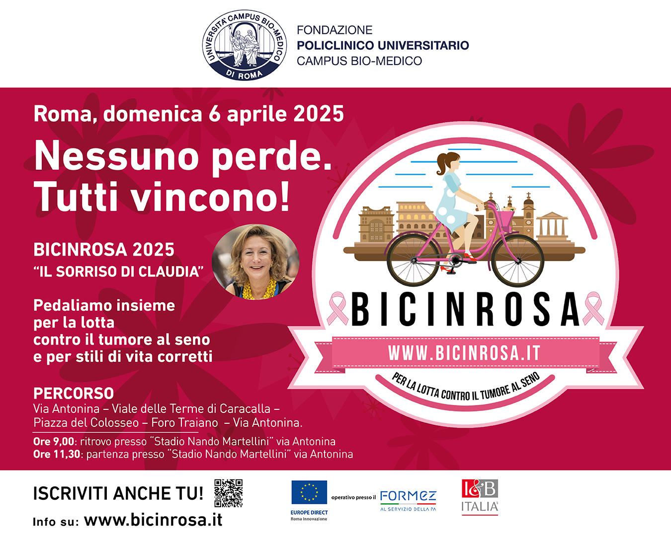 Nessuno perde. Tutti vincono! Questo lo slogan di Bicinrosa, pedalata solidale per le vie del centro storico di Roma (partenza e arrivo presso lo Stadio Nando Martellini, in via Antonina) che si terrà domenica 6 aprile 2025, come sempre promossa dalla Breast Unit della Fondazione Policlinico Universitario Campus Bio-Medico con la collaborazione con numerosi enti pubblici e privati.
